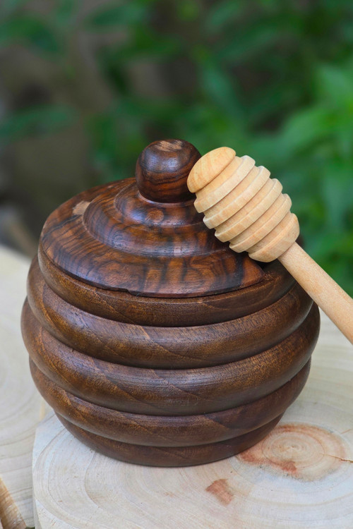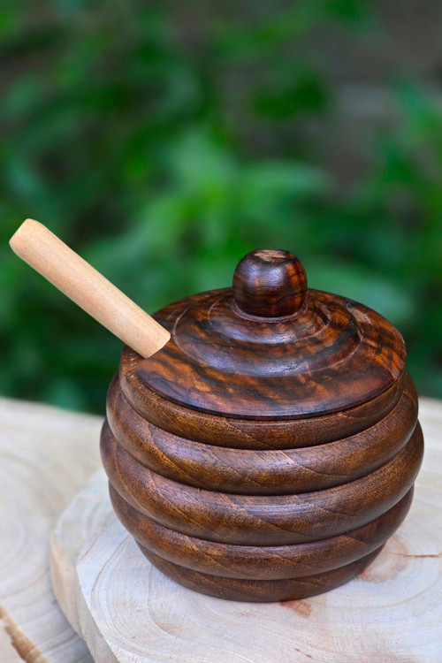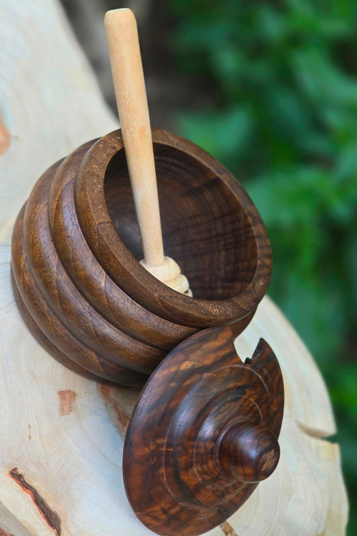 چوب گردوی سیاه از مقاومترین چوبهاست؛ بنابراین این ظرف نهتنها زیباست، بلکه دوام بالایی هم دارد و در برابر رطوبت و تغییر رنگ مقاوم است. درپوش چوبی و طراحی دستساز آن باعث میشود که عسل در شرایطی کاملاً طبیعی نگهداری شود.
