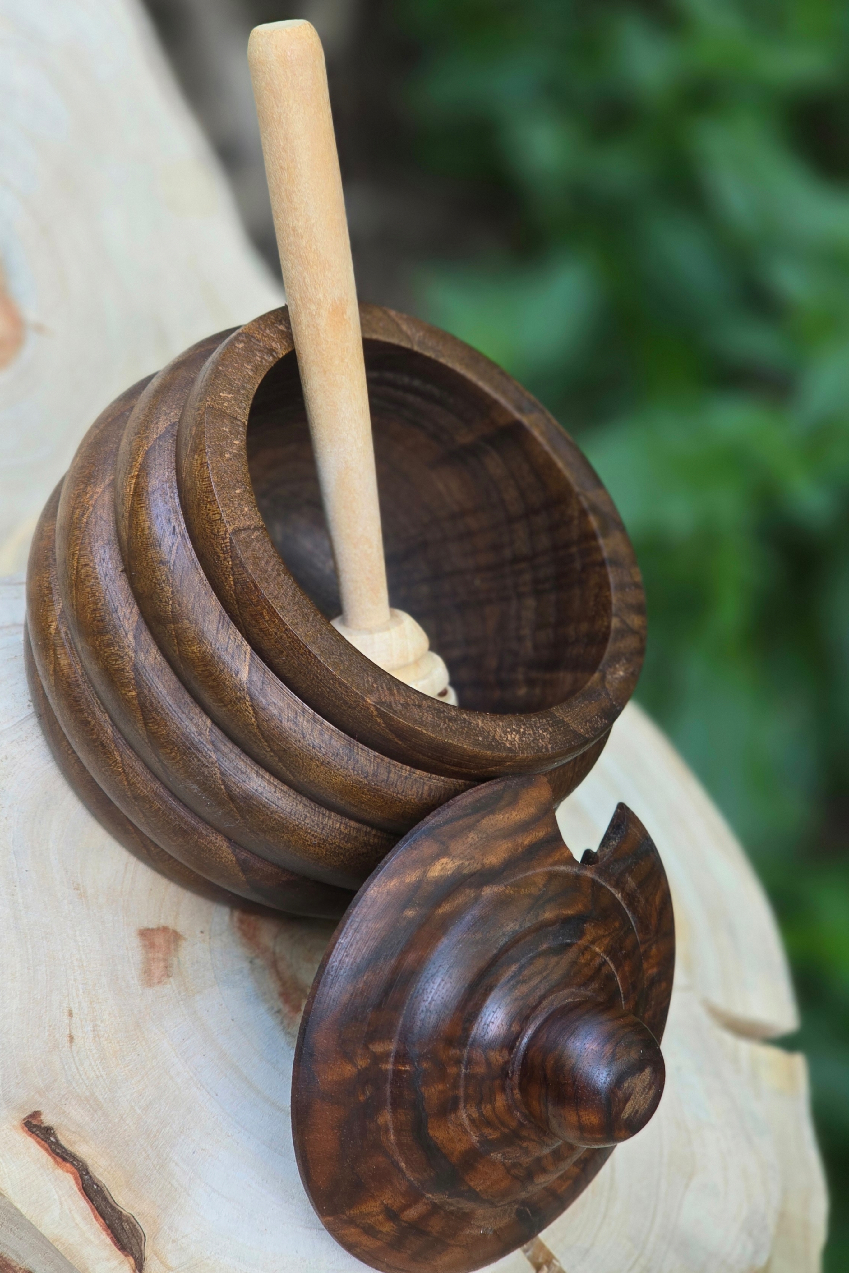 چوب گردوی سیاه از مقاومترین چوبهاست؛ بنابراین این ظرف نهتنها زیباست، بلکه دوام بالایی هم دارد و در برابر رطوبت و تغییر رنگ مقاوم است. درپوش چوبی و طراحی دستساز آن باعث میشود که عسل در شرایطی کاملاً طبیعی نگهداری شود.